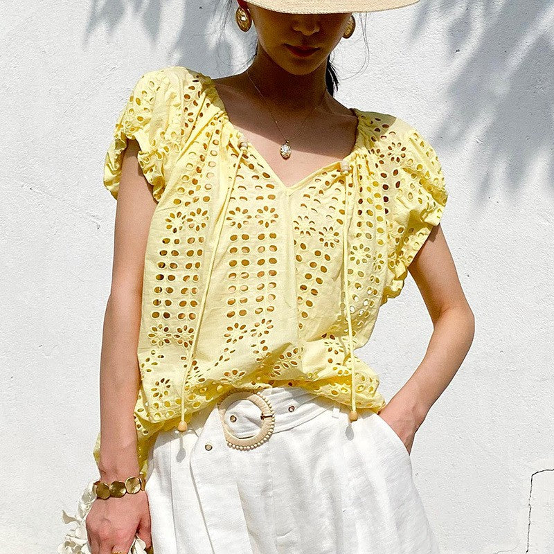 A French-inspired summer set featuring a loose embroidered top with quarter sleeves and matching shorts. Crafted from breathable cotton, this set embodies effortless vacation style.